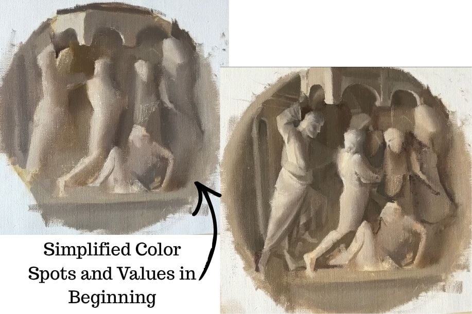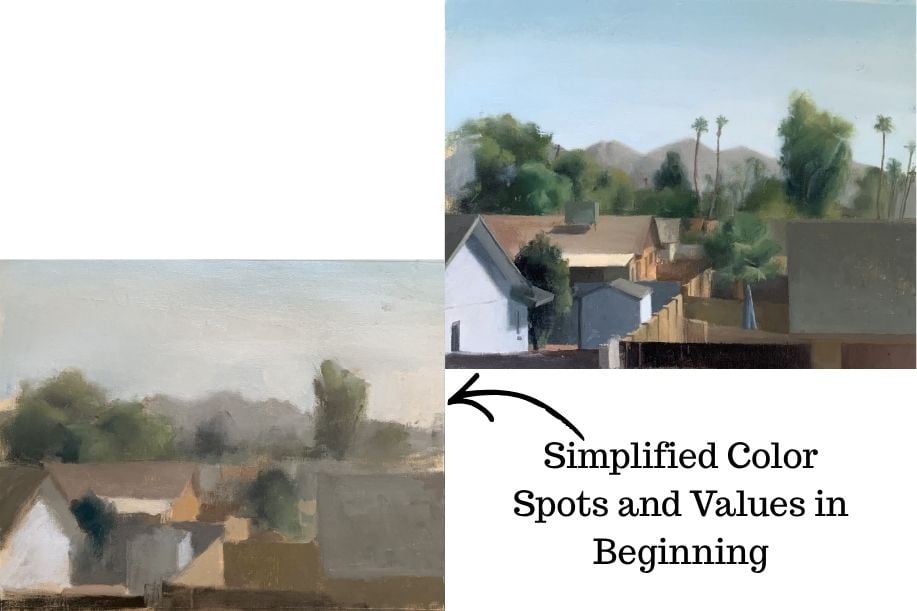 Once your large value and color shapes are established, you can begin refining them.